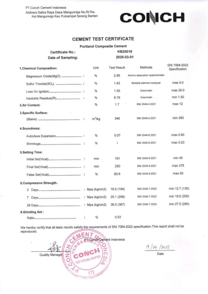 Produk semen yang kami distribusikan telah diuji secara laboratorium dengan parameter lengkap, mulai dari komposisi kimia, waktu setting, hingga kekuatan tekan. Semua hasil memenuhi standar SNI, memastikan campuran stabil dan struktur lebih kuat.